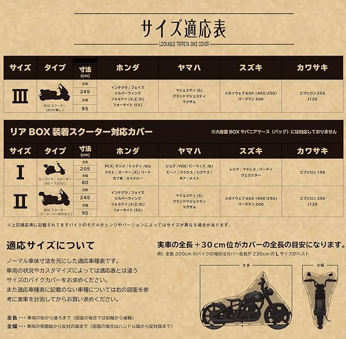 ・サイズ適応表は目安となります。適応表に車種がない場合や、お客様の好みの大きさ等はバイクカバー実寸法を参考ください。