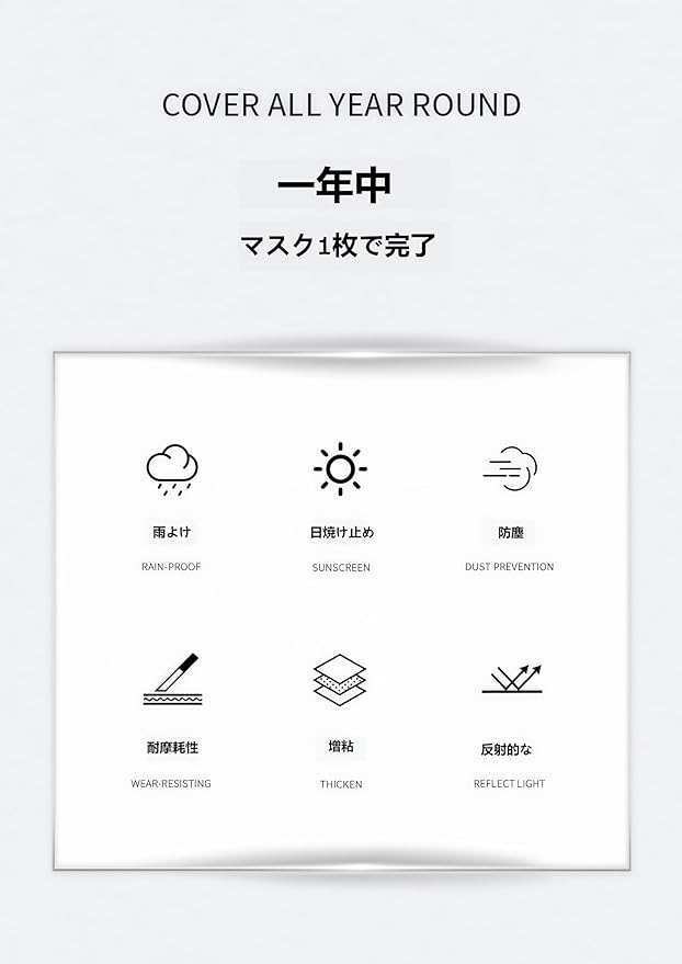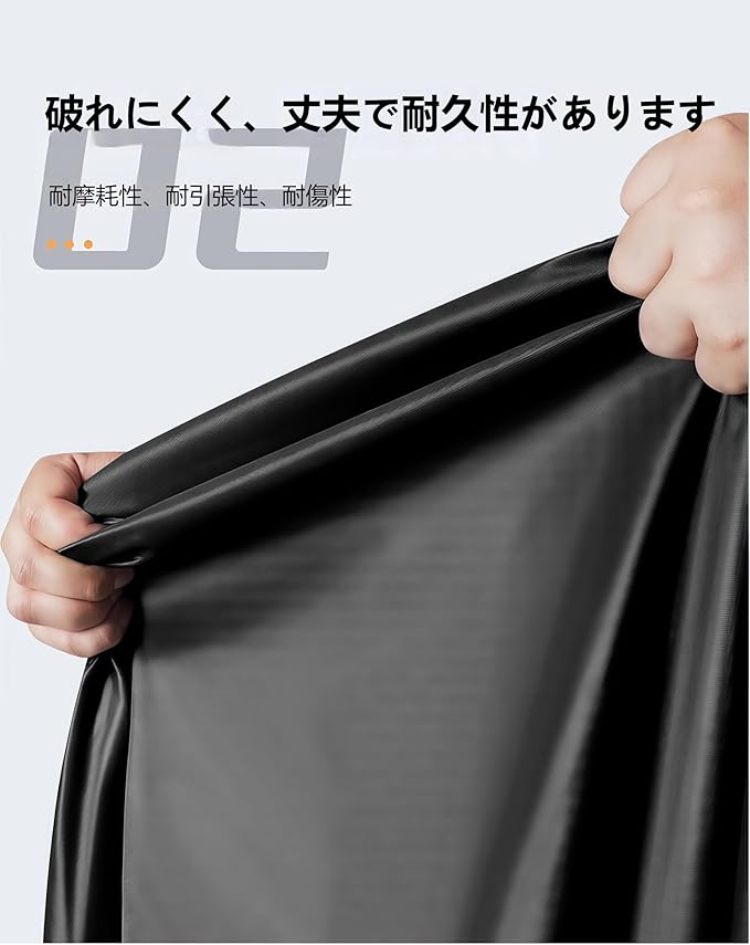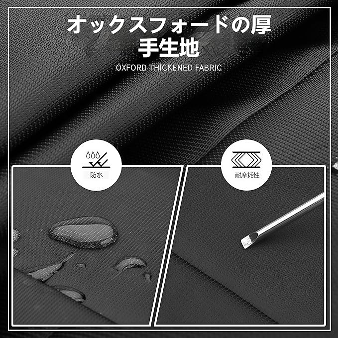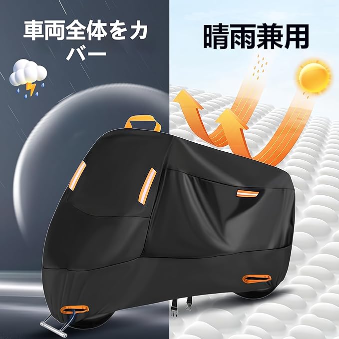 【防水防風】バイクカバーの表面層には防水加工を施し、雨水の浸入を防ぐとともに、風や雨や雪などの悪天候によるダメージから愛車を完全に保護します。バイクカバーの底は、伸縮性のある裾、調節可能なバックルを采用したデザインで、愛車をしっかりと包み込み、風の侵入を防ぎバタつきを抑え、雨、雪、ゴミ、砂埃などからの悪天候から大切な愛車を保護します