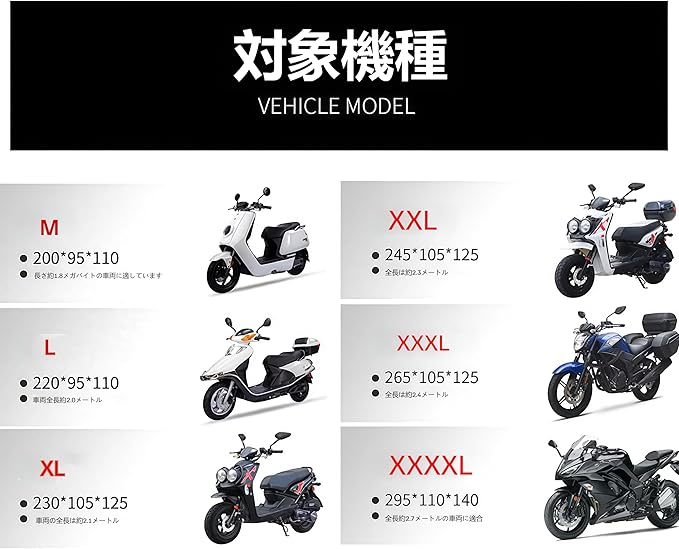 バイクカバー 420D厚手 バイク用レ 高防風 防埃 防雨 防水 防雪 紫外線防止 2025年新版 色褪せない 超撥水 警告反射テープ バイク用車体カバー 50cc 125cc 250cc 400cc 大型 前後ロック穴対応 盗難防止 (M:200*95*110CM)