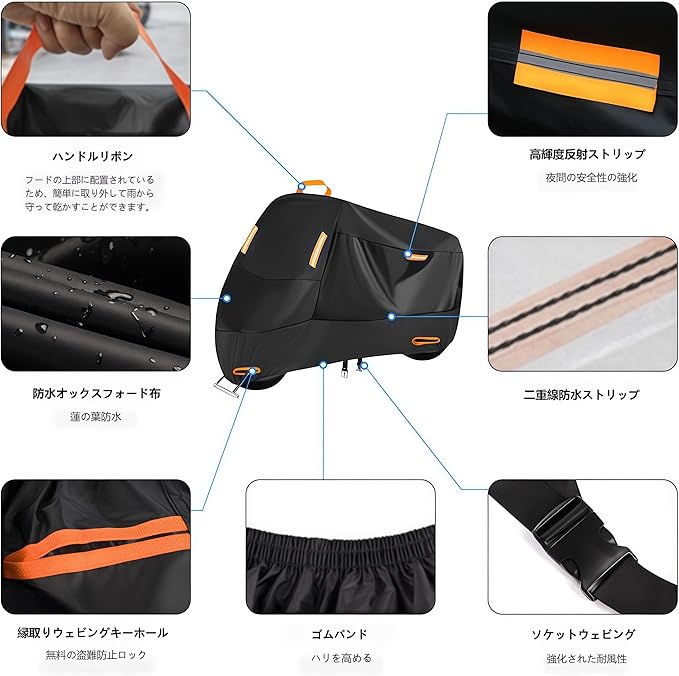 バイクカバー 420D厚手 バイク用レ 高防風 防埃 防雨 防水 防雪 紫外線防止 2025年新版 色褪せない 超撥水 警告反射テープ バイク用車体カバー 50cc 125cc 250cc 400cc 大型 前後ロック穴対応 盗難防止