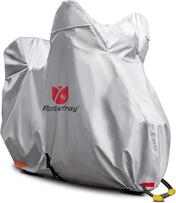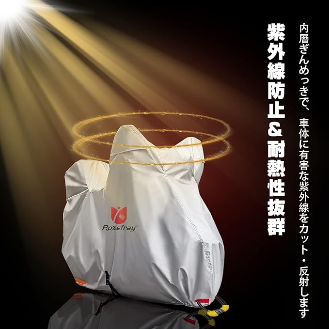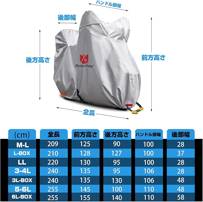 Rosefray バイクカバー 6L-BOX 210D 厚手 255cmまで対応 スマートサイズ 高機能 撥水 UVカット 大型 車体カバー 耐候性 収納袋付き(シルバー)