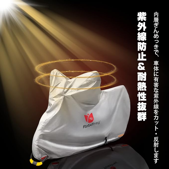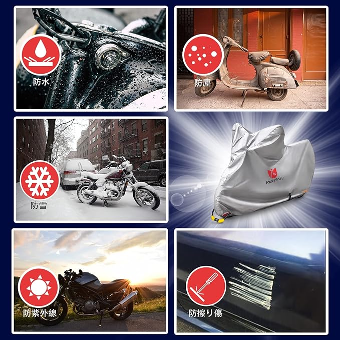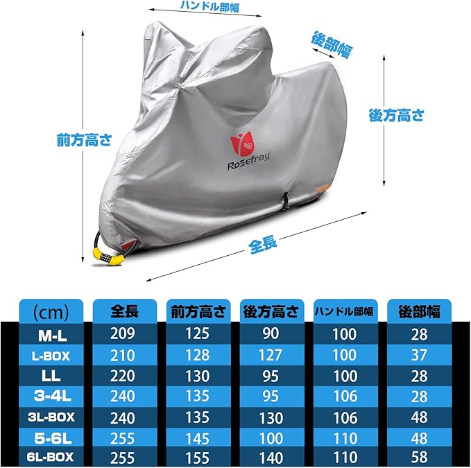 Rosefray バイクカバー 210D M-L 209cmまで対応 スマートサイズ 高機能 撥水 UVカット 小型 原付 車体カバー 風飛び防止 鍵穴付 収納袋付き