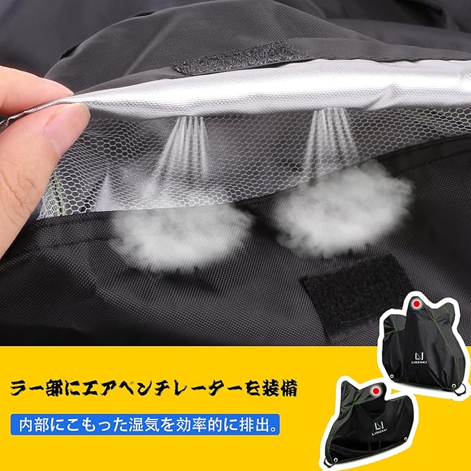 【防風、盗難防止設計】前後輪高弾力ベルトでカバーをより密着させています。前後にはすべてABS素材のロックホールを備えており、前後ともロックをかけることができます!中央には長くした調節可能な防風ループが2本ついており、二重の保護を提供しています!強風を恐れることがないです!