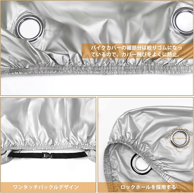 【風飛び防止&盗難防止】ワンタッチバックルをスポーク部分に通して留めれば突風などが吹いても風飛びの心配ナシ!そして、バイクカバーの裾部分は絞りゴムになっているので、風によるカバーのバタ付きもある程度抑えることができます。さらに、カバーの上から施錠できるよう、大きめのロックホールを採用しました。バイクとカバーをしっかりと守ることができます。盗難防止にも役立ちます。大型、極太のワイヤーロック、U字ロックにも対応します。