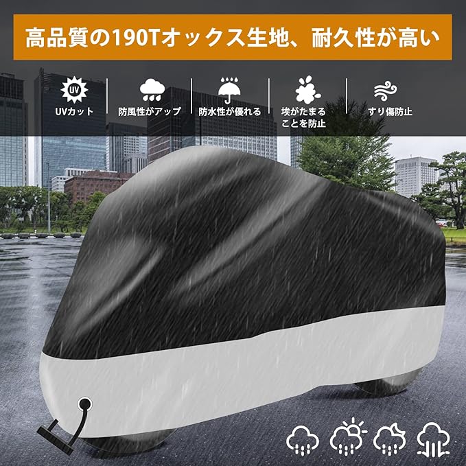 【高品質の素材】この厚手原付カバーは190Tポリエステル生地という厚手の素材を採用して、非研磨性で撥水性があり、軽量で非常に柔らかいです。また、基本素材に加え、高強度の繊維を格子状に編み込むことで、破れにくくほつれない高い耐久性を備えた生地のことです。