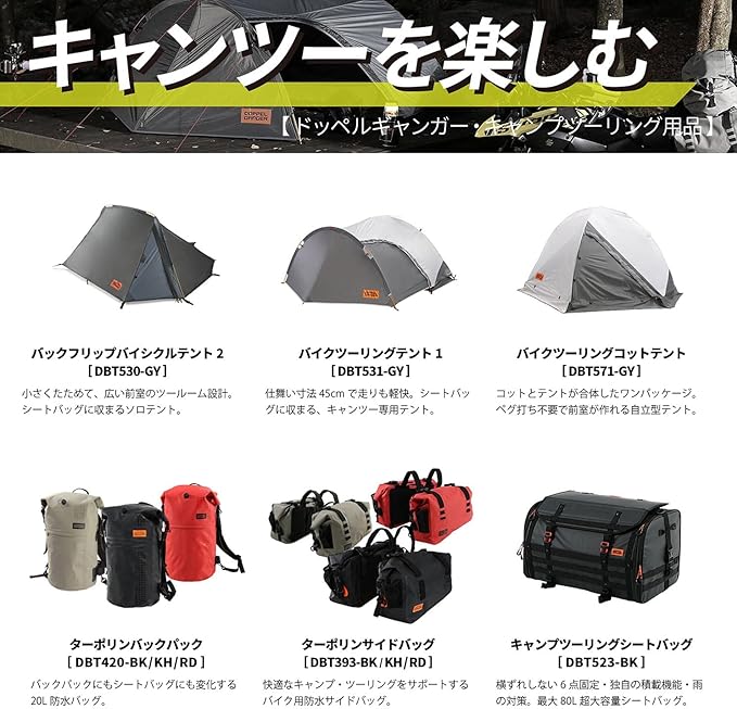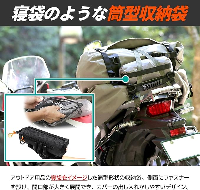 製品特徴: キャンプツーリング用ハーフカバー。持ち運びの携帯性に配慮したコンパクトなサイズかつ出し入れしやすいファスナー付き収納袋が付属。