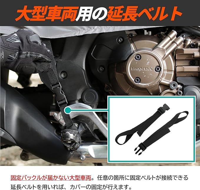 多彩なパッキングに対応するデイジーチェーンを配置。パニア装備車への着用を考慮した後方部幅広設計。フロントフェンダーまでカバー可能かつハンドルロック状態での装着に配慮したアシメントリーデザイン。