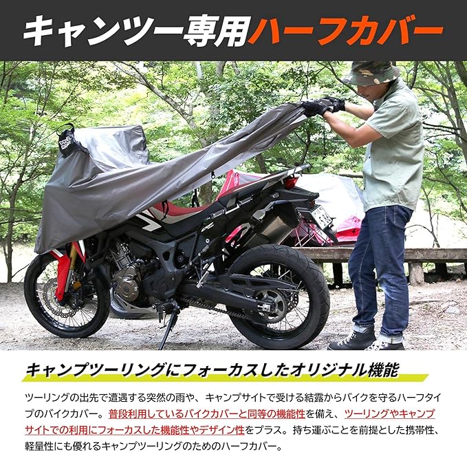 一時的に保護するだけじゃ物足りない。アウトドアギアのトレンドを取り入れ、バイクも映えるキャンプツーリング用ハーフカバー。