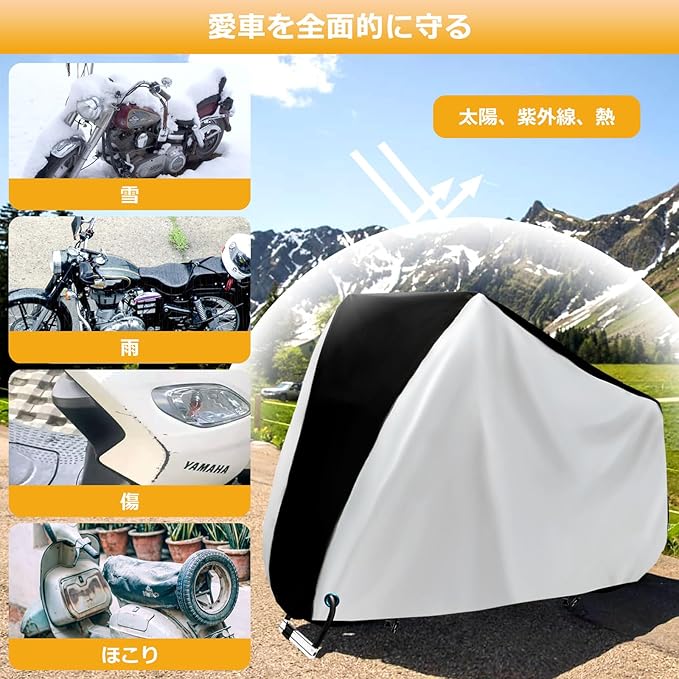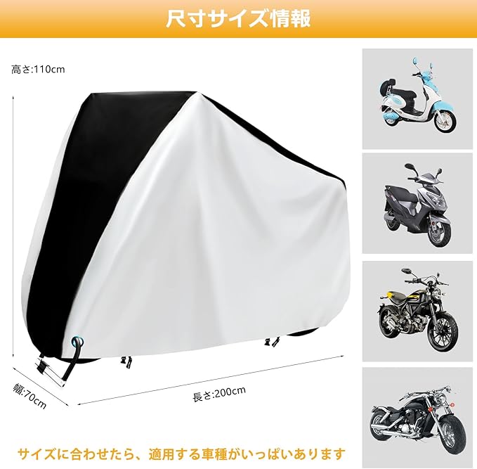 【原付、自転車、バイクカバー仕様】仕様サイズ:200*70*110cm、重さ:330g、原付バイクとバイクと自転車をカバー可能、カバーと同じの高品質素材の収納袋も付属されており、未使用時や持ち運びの際は専用ケースにコンパクトに収納できます。