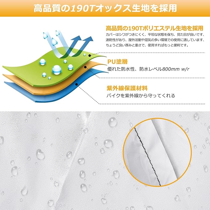 【撥水性抜群】強力撥水加工されたバイクカバー、縫い目までもしっかりとした作られたため、雨・風・紫外線にもご愛車をきちんと守れます。