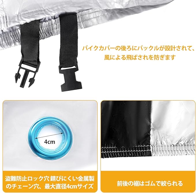 【風飛び防止・盗難防止】バイクカバーには、前部と裾にバックルが付いており、強風での飛び上がりを防止します、バイクをしっかりと保護し、安心してご使用いただけます。前部に盗難防止のリング穴がついているので、ワイヤーロックを取り付け可能です。