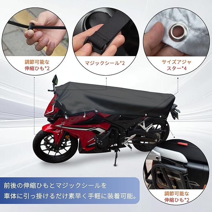 ✅【調整穴でサイズ調整】前後の伸縮ひもとマジックシールを車体に引っ掛けるだけ素早く手軽に装着可能、任意の箇所に固定伸縮ひもを利用すればカバーの固定が行えます。✅前後複数の調整穴をご用意し、かさばりなく全ての車種にも合わせる使えます。✅着脱が楽だから以外に使いやすいため、毎日使うカバーとしてもお勧めです。