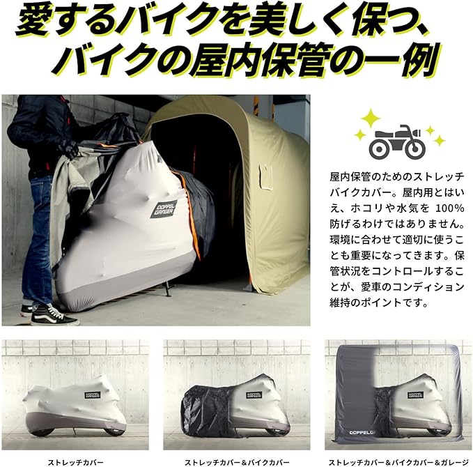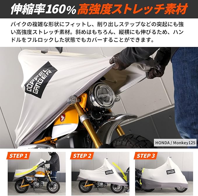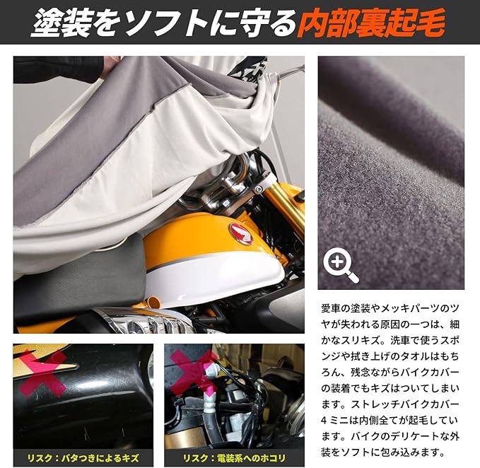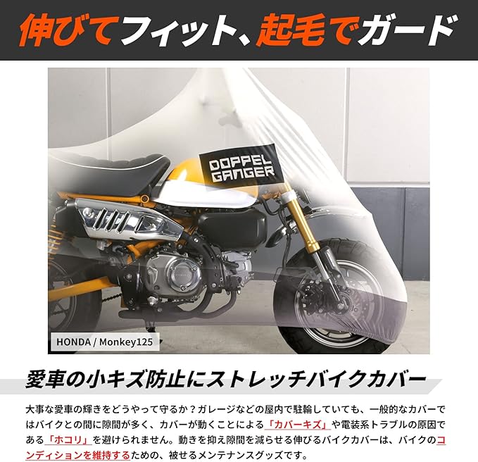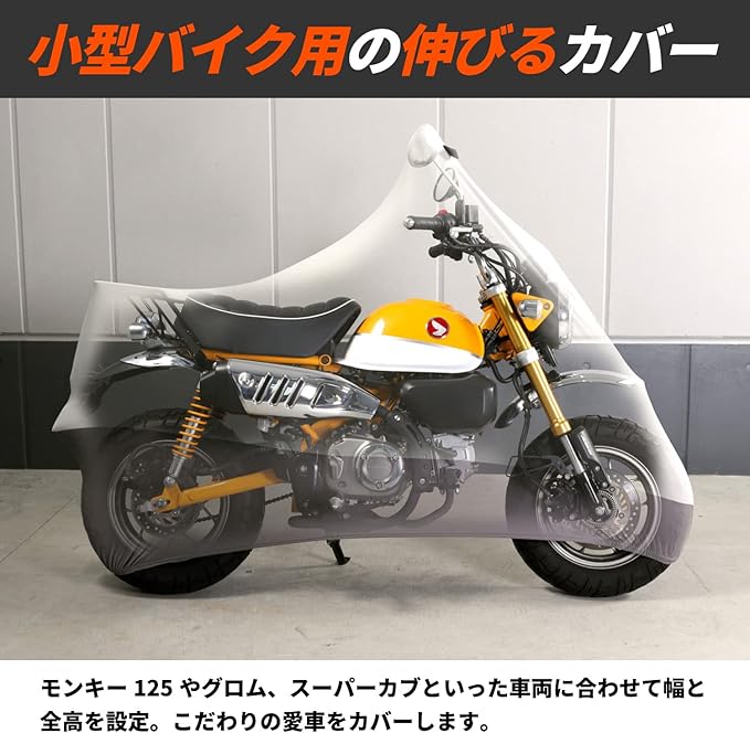 ●小型バイク用に設計した、伸びるカバー 小型バイクは全長が短く全高も低いために、従来のカバーでは余った生地で床の土埃を拾ってしまいます。 ストレッチバイクカバー4ミニは、モンキー125やグロム、スーパーカブといった車両に合わせて幅と全高を設定。 こだわりの愛車をカバーします。 ●伸びるからフィット! 伸縮率160%の高強度ストレッチ素材 バイクの複雑な形状にフィットし、削り出しステップなどの突起にも強い高強度ストレッチ素材。 斜めはもちろん、縦横にも伸びるため、ハンドルをフルロックした状態でもカバーすることができます。 愛車の外装を守りつつカバーをフィットさせるため、開口部は160%の有効伸縮率を持たせてあります。 ●カバーの中は全て裏起毛 愛車の塗装やメッキパーツのツヤが失われる原因の一つは、細かなスリキズ。洗車で使うスポンジや拭き上げのタオルはもちろん、 残念ながらバイクカバーの装着でもキズはついてしまいます。ストレッチバイクカバーADVは内側全てが起毛しています。 バイクのデリケートな外装をソフトに包み込みます。 ●ストレッチバイクカバーを使った、屋内保管 屋内保管のためのストレッチバイクカバー。屋内用とはいえ、ホコリや水気を100%防げるわけではありません。 環境に合わせて保管状況をコントロールすることが、愛車コンディション維持のポイントです。 ※バイクガレージ+カバー+ストレッチカバーの保管例(画像はDCC533-GYです) ●立体構造 バイクの形状に合わせた立体構造。ハンドルロックの状態でも、被せやすさとバイクのシルエットを両立します。 ●収納袋 ストレッチバイクカバー本体と共地の収納袋が付属します。