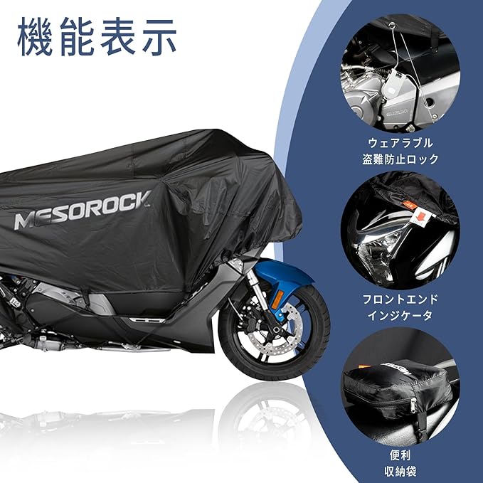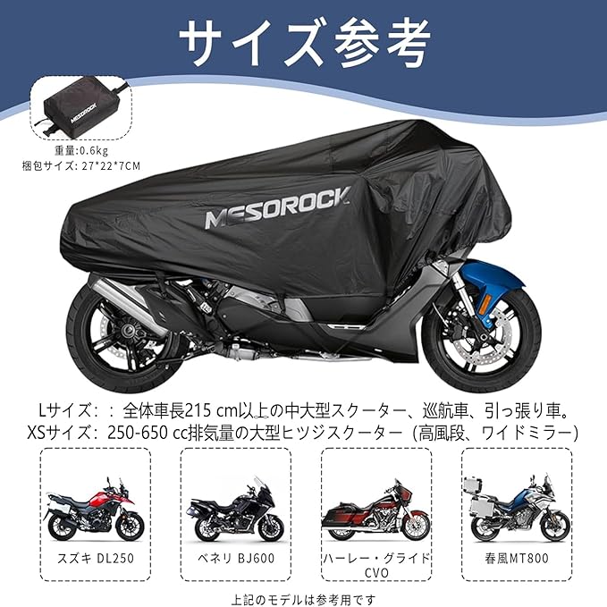 【高い撥水効果】バイクの長さが215 cm以上の車種用は、215 cm未満の車種でも使用でき、下に隠れる部分が一部多くなります。表面にPU材料が塗布されており、雨、雪、ほこり、ゴミ、ポリウレタン塗料なら撥水性、防水性が優れる、内側の生地も柔らかくになる、着脱時の傷が最小限に抑えられる、摩擦などから最小限に抑えることができます。