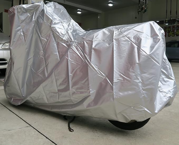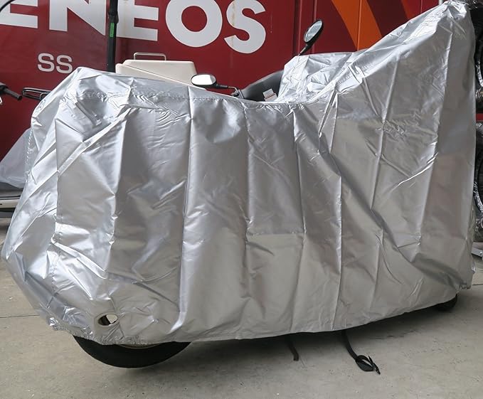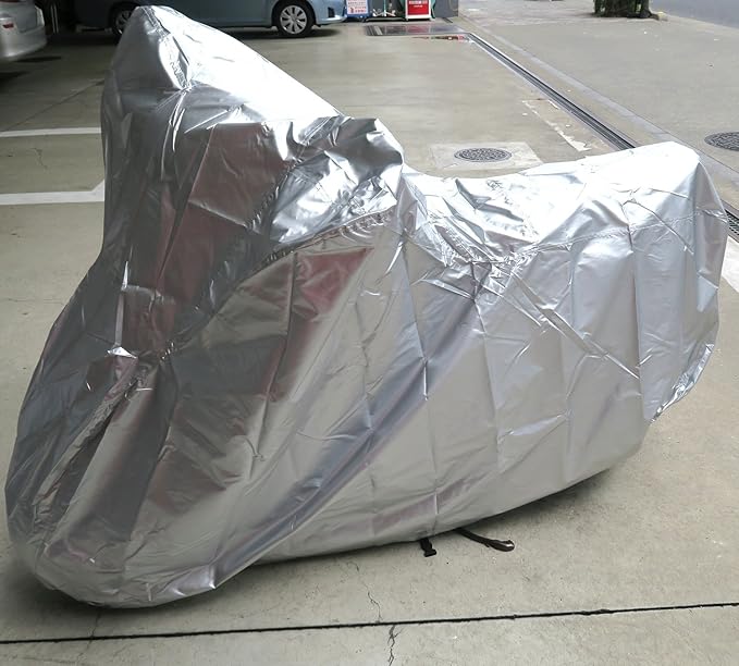 【適合サイズ】中型ボディーのミニバイク・125ccバイク小型ボディーの汎用、【商品サイズ】(約)全高122cm 全長210cm、【カラー】表:シルバーカラー(銀)、【内容量】1点入り、【素材】表地:ポリエステル 、【生産国】中国