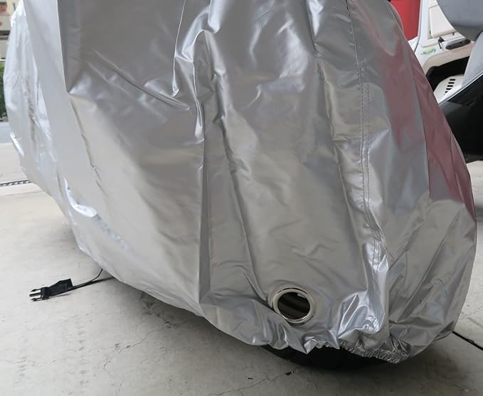 カバーを装着する前にエンジン、マフラーが充分に冷えたことを確認してください。確認を怠るとカバーが溶けて使用できなくなります。汎用タイプなのでぴったりフィットしない場合がありますが、ロック用リングと風飛防止用ワンタッチベルトが付いていますので心配はありません。
