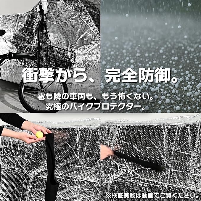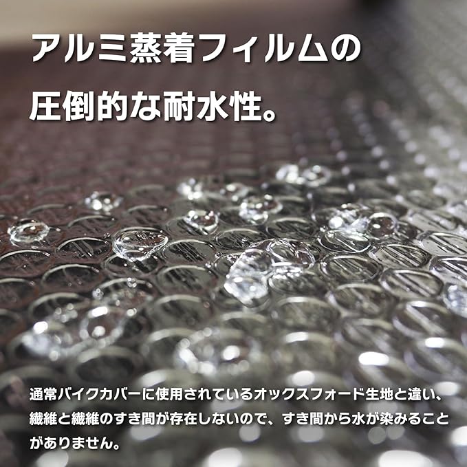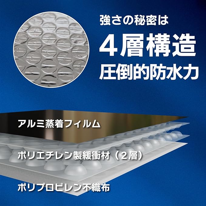 衝撃吸収に特化した四層構造設計|アルミシート(表面)、ポリエチレン製緩衝材シート(2層構造)、PP不織布(裏面)の4層構造。素材部分の浸水はゼロ、降雹や隣車両からの衝撃に耐える超耐水・耐衝撃の超特化型バイクカバー。