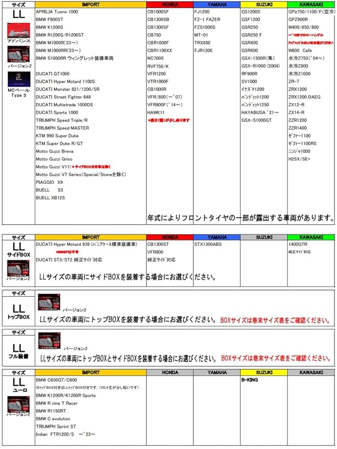※LL車輌のサイドボックス対応=《LL適合車種国産車》【ホンダ】CB1300 SB/SF、VFR1200、CBR1100XX、NC750/700、【ヤマハ】MT-01、XJR1300/1200、VMAX(~2008)、FZ-1 FAZER、【スズキ】GSX1300R HAYABUSA、バンディッド1250/1200、GSX1100S KATANA、GSR600/400/250、【カワサキ】ZZR 1400/1200、ゼットアールエックス 1200/DAEG、ZEPHYR 1100/RS、W800/650/400