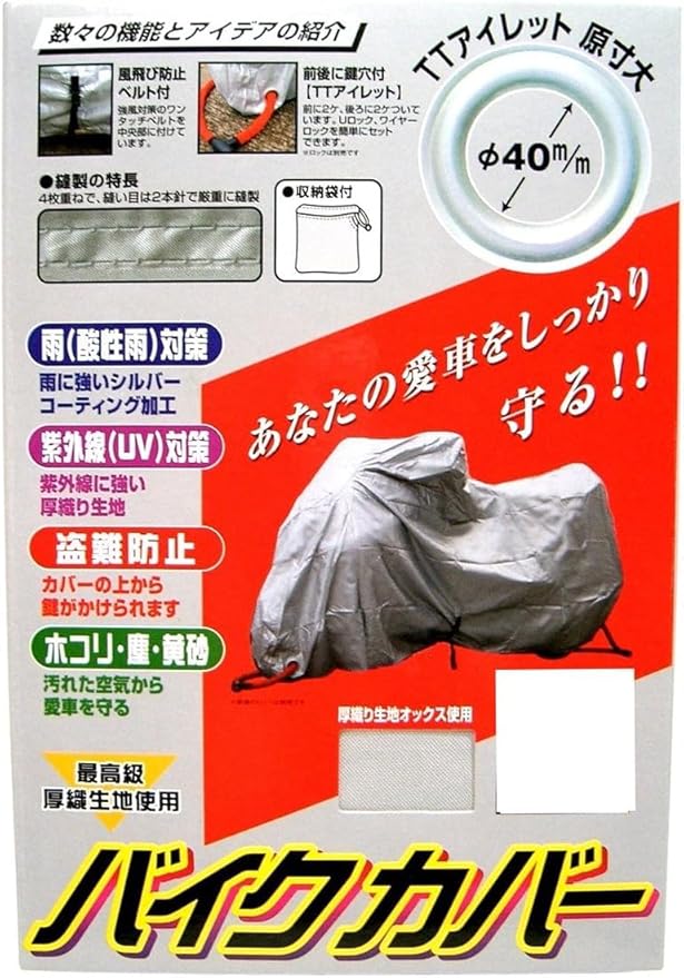 ●厚手のオックス300D生地を使用した実用性と耐久性を実現したボディカバーです。 ●安いのはすぐに破れてちょっと・・・という人にお勧めです。 ●ワンタッチで止められる風飛び防止ベルトが中央部分についています。 ●更に前後の4ヶ所に内径40mmの鍵穴(TTアイレット)が付いているので、U字ロックやワイヤーロックがボディカバーを通して簡単に確実にセット出来ます。 ●盗難予防と風飛び予防の両方に高い効果が期待出来ます。 ●サイズはメーカーHPなどでご確認ください。