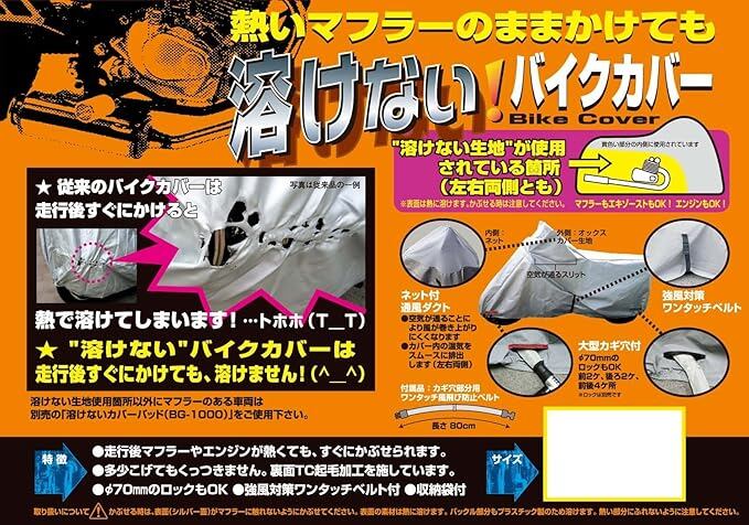 ●耐熱加工を施した新素材を採用しマフラーやエキパイが走行後の熱い状態でもカバーをかける事が出来ます。 ●カバーの前後にロック用の穴付き(フロント側は赤、リア側は黒にしてありカバーの前後がすぐに分かります。) ●ワンタッチ風飛び防止ベルト装備 (左右どちらからでもベルトの調整可能) ●左右ミラー付近に快適エアーベンチレーション付き。 ●カバー内の湿気を逃がす事により、内部を快適に保ち、湿気により発生するサビをつき難くする効果があります。 ●サイドBOX装備車専用。 ●車体カバーの収納袋付。