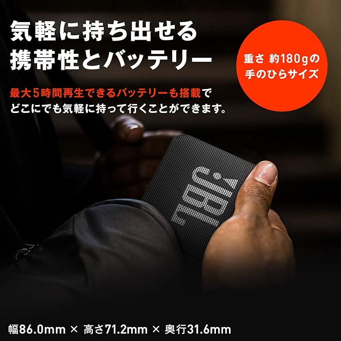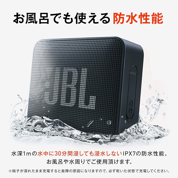 海辺やプールサイドでも安心して使えるIPX7に対応したJBL GO ESSENTIALは、万が一の水没にも対応。屋外でのレジャーを盛り上げるアイテムとしてはもちろん、キッチンや浴室など日常使いの良きパートナーとして、いつでもどこでも安心してJBLサウンドをお楽しみいただけます。