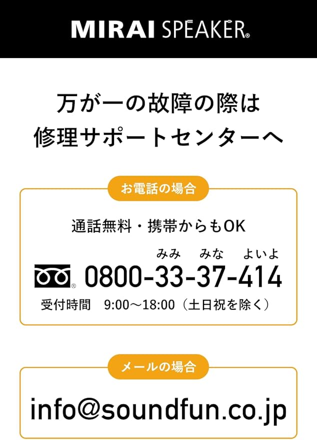 【故障かな?と思ったら】 万が一不具合が生じた場合、販売元までお問い合わせください。 症状を確認し修理や交換についてご案内させていただきます。 【使用方法の注意点】 ①大音量で継続して使用するとスピーカーに負荷がかかり早期に故障する可能性がございます。スピーカーから出る音が割れない範囲の音量設定でご使用ください。 ②本機を接続するテレビの端子はイヤホン端子です。誤った端子に接続すると音が出なかったり故障の原因となりますのでご注意ください。