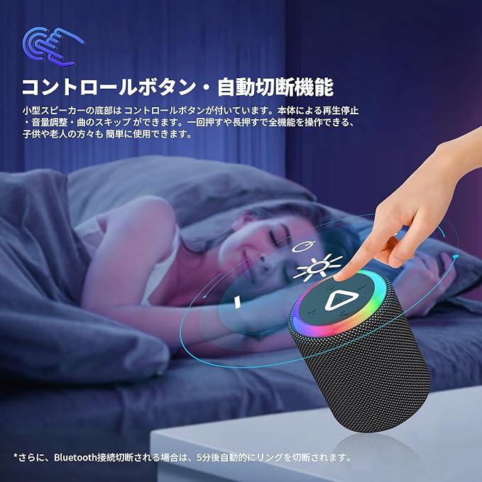 【自動切断機能&ダイナミックライト】Bluetooth接続切断あるいは再生しない場合は、10分後自動的に切断し、スピーカーの電量を節約します。このスピーカーのライトは複数段階で調節できます、内蔵されたライトエフェクトは音楽のリズムに合わせて自動的に変化し、パーティーやイベントを華やかに演出します。ロマンチックな雰囲気を作り出す夜のライトとしても使用でき、休日やお祝いの日に最適です。
