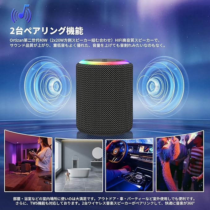 【360 立体声操作&2台ペアリング機能】コンパクトなデザインで驚異的なサウンドを体験できます。このBluetoothスピーカーは、鮮明な高音、まろやかな中音域、豊かな低音を提供し、歪みのない臨場感あふれるサウンドを実現します。2つのスピーカーを同時に購入すると、2台ペアリング機能で2つのスピーカーをペアリングして、映画館のような360 ステレオサウンドを楽しんていただけます。