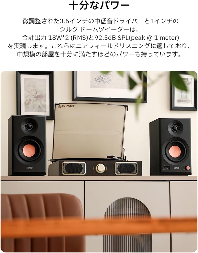 【十分なパワー】微調整された3.5インチの中低音ドライバーと1インチのシルク ドームツイーターは、合計出力 18W*2 (RMS)と92.5dB SPL(peak @ 1 meter)を実現します。これらはニアフィールドリスニングに適しており、中規模の部屋を十分に満たすほどのパワーも持っています。