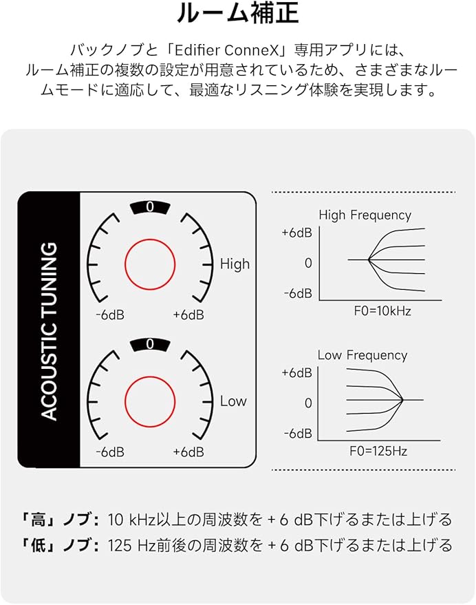 【ルーム補正】バックノブと「Edifier ConneX」専用アプリには、ルーム補正の複数の設定が用意されているため、さまざまなルームモードに適応して、最適なリスニング体験を実現します。