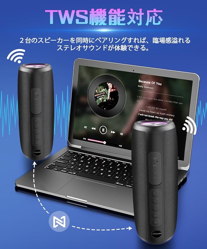 【Bluetooth 5.3接続&TWS機能対応】ワイヤレススピーカーは業界最新のBluetooth 5.3接続技術を利用して、安定した接続と迅速に高音質の伝送を実現します。最大の伝送距離も10mに達しています。また、ワイヤレススピーカーは幅広い交換性があり、パソコン、スマートフォン、iPad、テレビなど、すべてのBluetoothデバイスに簡単に接続できます。そして、ワイヤレススピーカーはTWS機能が搭載され、本機を2台同時に購入すれば、2台ペアリング機能で2つのスピーカーを同時にペアリングすれば、家でも映画館のような、臨場感溢れるステレオサウンドが体験できます。