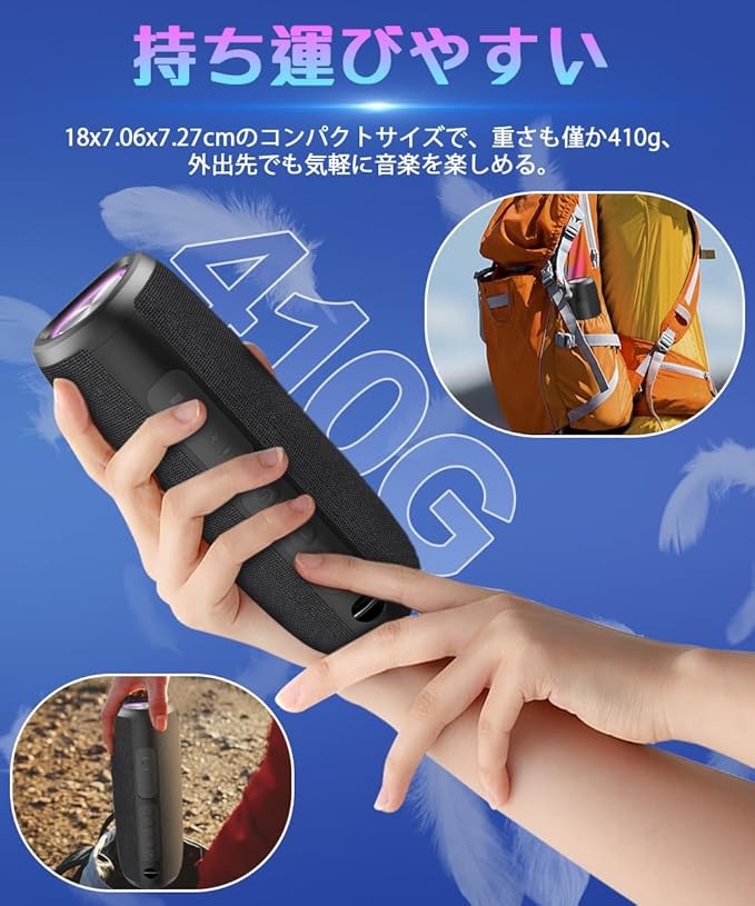 【Type C充電式&持ち運びやすい】ブルートゥース スピーカーはType C充電式なので、モバイルバッテリーやパソコンなどのUSBデバイスで簡単に充電できます。また、ブルートゥース スピーカーは18x7.06x7.27cmのコンパクトサイズで、重さも僅か410g、非常に小型で持ち運びやすいです。オフィス、アウトドア、家、車内など様々な場合に大活躍します。そして、ブルートゥース スピーカーはIPX7防水性能が備えるので、海やプールなど、お風呂場での利用も心配ありません。(※ご注意:ずっと水に完全に浸さないでください。)
