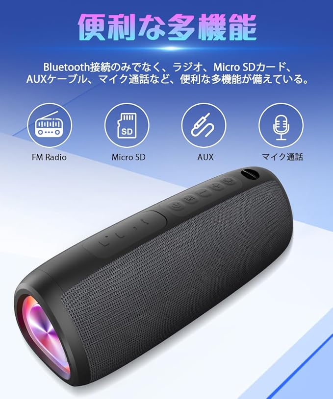 【便利な多機能&4種類のLEDライト効果】ポータブルスピーカーはBluetooth接続のみでなく、ラジオとしても使えます。また、TF/Micro SDカードを挿入し、直接に音楽再生できます。付属のAUXケーブルを接続して、有線スピーカーとしても使用できます。内蔵マイクでハンズフリー通話にも対応します。そして、ポータブルスピーカーはリズムライトやカラフルな回転ライトや呼吸ライトや温白色ライトなど4種類のLEDライト効果があります。使用中に音楽に合わせてLEDライトが変化できて、違った雰囲気を演出します。