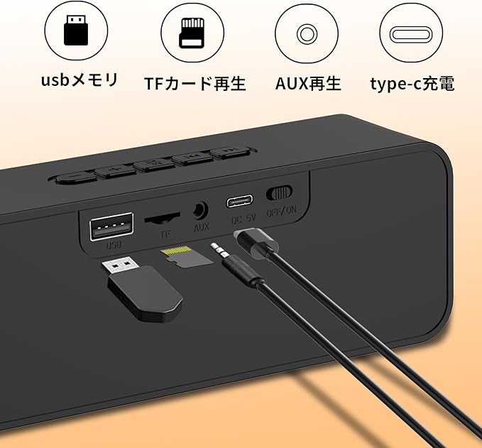 【ワイヤレス・有線連続再生可】:iPhoneやAndroidのスマートフォン、タブレットなど、多くの端末と簡単に接続可能なワイヤレススピーカーです。TFカードやUSBメモリーに保存したMP3形式の音楽を再生できるミュージックプレーヤー機能付きのため単体でもジュークボックスとして使用可能です。FMとAUXが付属していてFM局をワンクリックで検索できます。