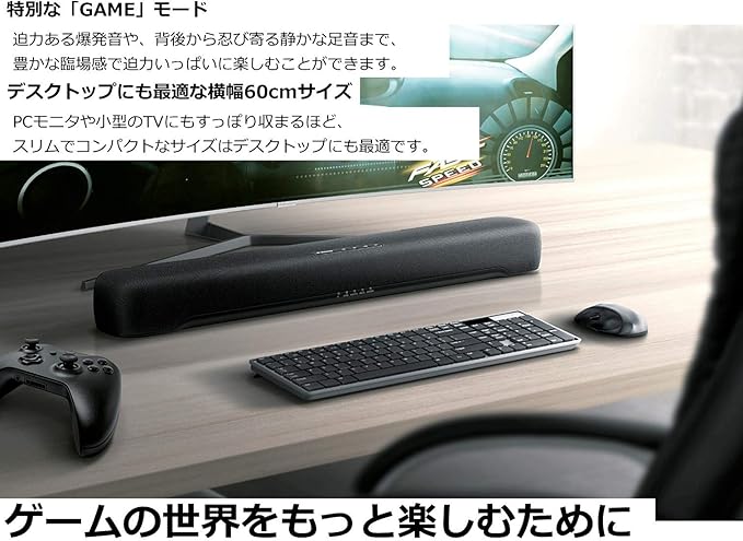 横幅60cmのコンパクトボディで、テレビの音を聴きやすく映画やゲームなどもサイズを超えた豊かな臨場感で楽しめるサウンドバー