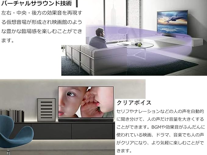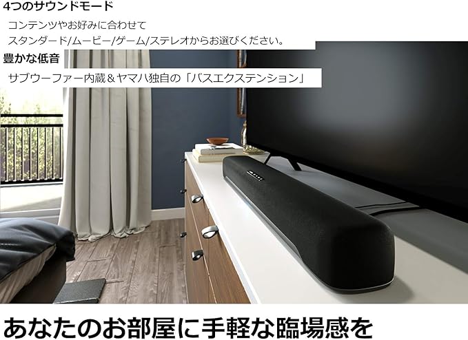 「クリアボイス」や「バスエクステンション」、ヤマハ独自チューニングのサラウンド技術によりテレビの音を聴きやすくグレードアップし、サイズを超えた豊かな低音と臨場感を再現