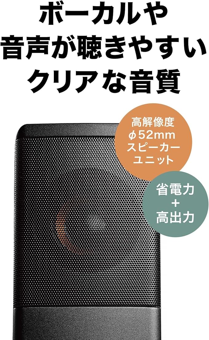 【コンパクトに、いい音が聴ける】ボーカルや音声が聴きやすい高感度φ52mmスピーカーユニットを搭載し、長時間でも聴き疲れしないクリアな音質を実現。また、2W+2Wの出力ながら、高感度スピーカーユニットにより省電力でもナチュラルな サウンドを再生します。ステレオサウンドのためPCやポータブルプレーヤー自体で音を再生するよりも迫力のある立体感がお楽しみいただけます。観たい動画や映画をより聴きやすい音で再生できます。