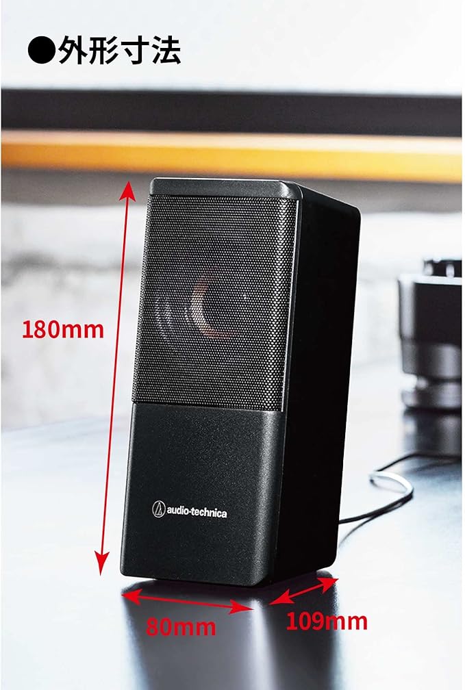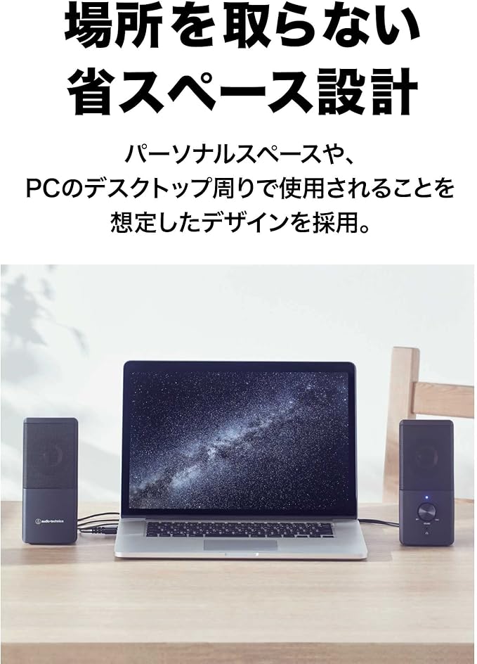 【部屋に馴染みやすいシンプルデザイン、省スペース設計】パーソナルスペースや、PCのデスクトップ周りで使用されることを想定したデザインを採用。コンパクトボディのため、最小限のスペースで使うことができます。PCやオーディオ機器とつながるオーディオ/USBコードの長さは取り回しやすい1.2m。左右のスピーカーをつなぐ渡りコードは、デュアルモニターでも使える1.5mの長さで設計しています。様々なデスク環境で邪魔にならず、馴染みやすいデザインのスピーカーです。