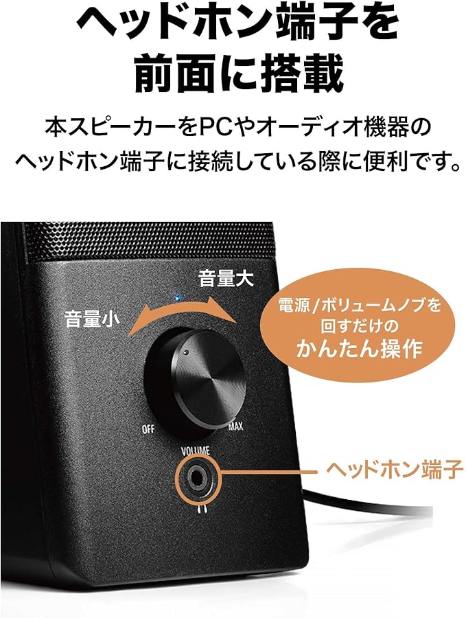 ◆快適なおうち時間を。豊かな音に包まれるアクティブスピーカー。◆PCやオーディオ機器などのUSBポートにUSB Type-Aプラグを、ヘッドホン端子にφ3.5mmステレオミニプラグを接続すればセッティングが完了。◆長時間でも聴き疲れしないクリアな音質を実現。ステレオサウンドのため、PCやポータブルプレーヤー自体で音を再生するよりも迫力のある立体感がお楽しみいただけます。◆2W+2Wの出力ながら、高感度スピーカーユニットにより省電力でもナチュラルなサウンドを再生します。◆スピーカー前面のヘッドホン端子にお持ちのヘッドホン(別売)をつないで楽しめるだけでなく、ヘッドホン接続時の音量もスピーカー側で調整可能です。◆ノブ回すだけで電源が入り、音量調整を行なうことができます。◆PCやオーディオ機器とつながるオーディオ/USBコードの長さは取り回しやすい1.2m。また、左右のスピーカーをつなぐ渡りコードは、デュアルモニターでも使える1.5mの長さで設計しています。