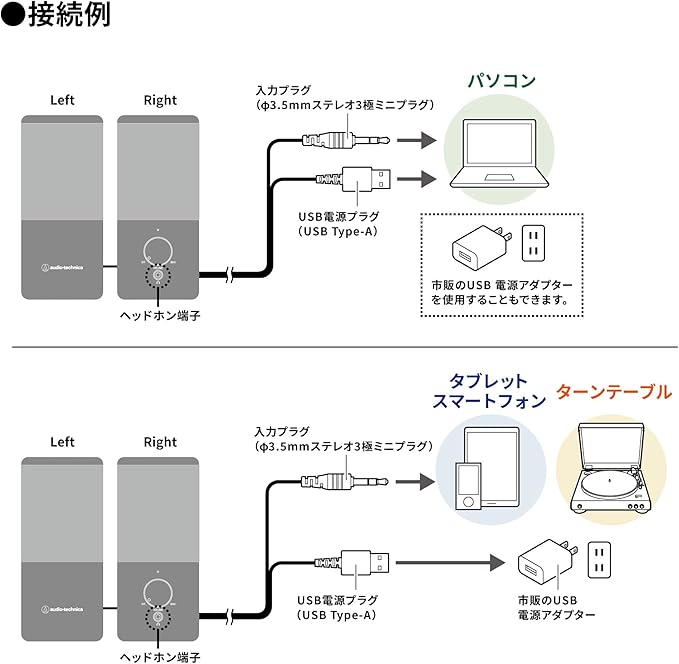 【コンセントのいらないUSB給電タイプ】PCやオーディオ機器などのUSBポートにUSB Type-Aプラグを、ヘッドホン端子 にφ3.5mmステレオミニプラグを接続すればセッティングが完了。音楽を聴きたいときに、PCやオーディオ機器にある2つの端子に接続するだけで簡単にすぐに使えます。また、有線接続なので音が遅れて聴こえるような心配もありません。