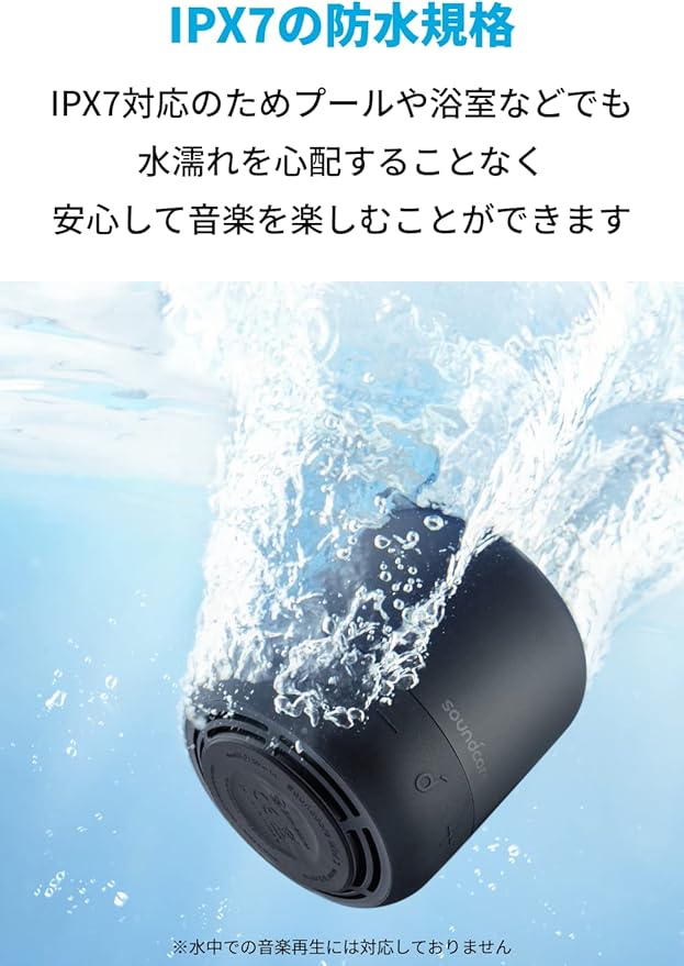 IPX7の防水規格 : IPX7対応により、キャンプなどのアウトドアや浴室内、キッチンなどでも水濡れを心配することなく安心して音楽を楽しむことができます。