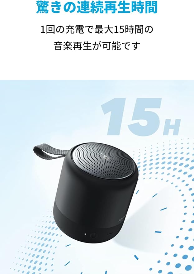 驚きの連続再生時間:1回の充電で最大15時間の音楽再生が可能です(※音量と再生する内容によって多少異なります)。