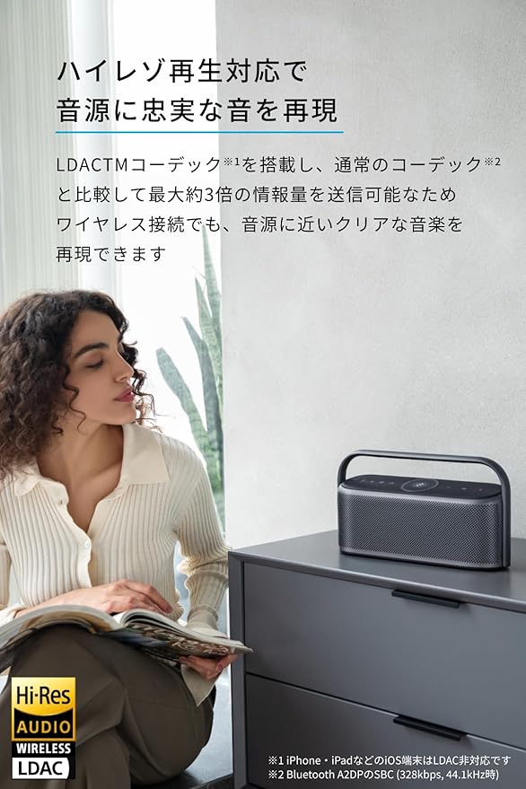 ハイレゾ音源再生にまで対応:LDACコーデックを搭載し、通常のSBCコーデックと比較し、最大約3倍の情報量を送信することが可能なため、ワイヤレス接続でも原音に近いクリアな音楽を再現。