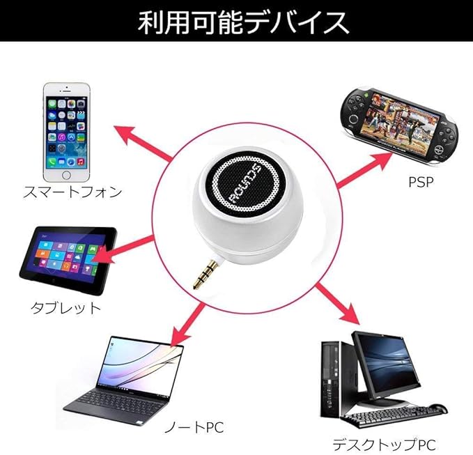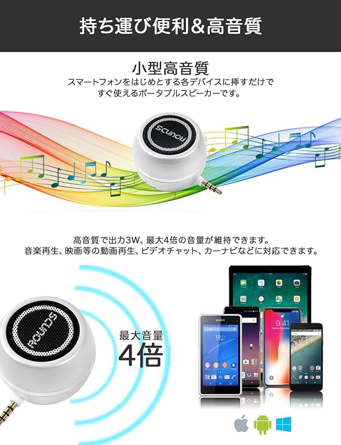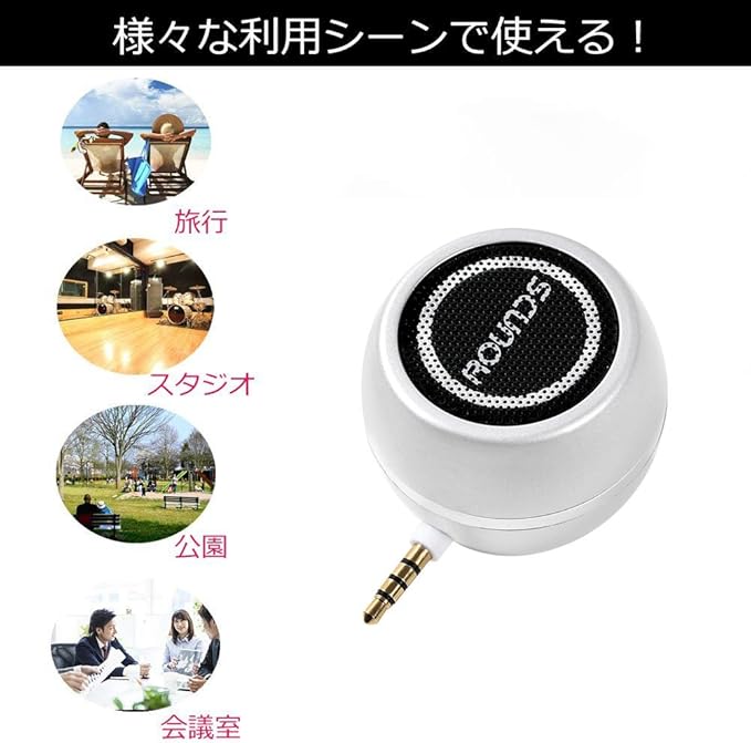 【高音質の小型スマホスピーカー】スマートフォンをはじめとする各デバイスに挿すだけですぐ使えるポータブルスピーカーです。bluetoothスピーカーのような面倒な操作は一切なく押すだけワンタッチでご使用いただけます。重さ30g、横3.5cm、縦3.3cmのコンパクト仕様で携帯性抜群ミニスピーカーです。屋外 野外へも持ち運びも楽々。