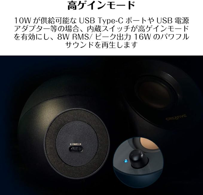 【ケーブル2本接続タイプ:USBから電源 & アナログケーブルで音声を入力】【USB Type-C & A 対応】USB Type-C接続では8W RMS(ピーク出力16W)のパワフル サウンドを実現