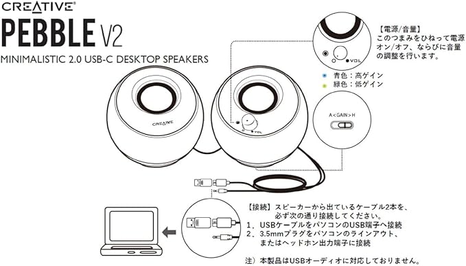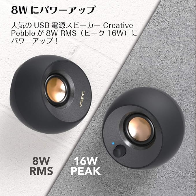 Creative Pebble V2 USB Type-C給電採用アクティブ スピーカー 8W RMS ピーク出力16W パワフル出力 45 上向きドライバー 重低音 パッシブ ドライバー SP-PBLV2-BK