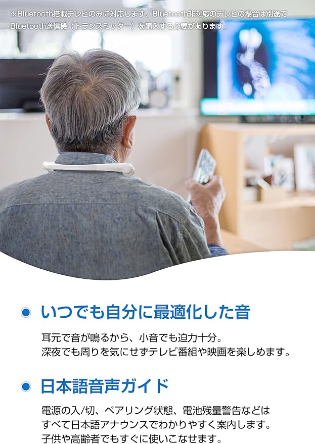 【耳元で音が鳴るから、小音でも迫力十分】耳元スピーカーなので、通常のブルートゥース スピーカーよりもっと小さい音量でも十分に聞こえます!いつでも個人に最適化された音量で楽しめます。音漏れが最小限に抑えられ、テレビスピーカーとして深夜でも周りを気にせずテレビ番組や映画を楽しめます。また、テレビの音が聞こえにくい高齢者にもおすすめです。 【最新Bluetooth 5.3搭載&2台同時接続可能】2024年最新のBluetooth 5.3を採用。市販のBluetooth 5.0より消費電力が少なく、もっと安定した接続と高速通信を実現します。マルチポイント対応で2台のデバイスと同時に接続可能です。省電力で電池長持ち、最大10時間連続再生可能。USB-Cポートを採用、家でも外出先でも手軽に充電できます。Bluetooth搭載のスマートフォン、タブレット、ノートパソコン、ゲーム機、iPhone・iPad、テレビなどに最適です。※ご注意:本品にはBluetooth送信機を付属しておりません。Bluetooth非対応のテレビの場合は市販のBluetooth送信機を購入する必要がございます。