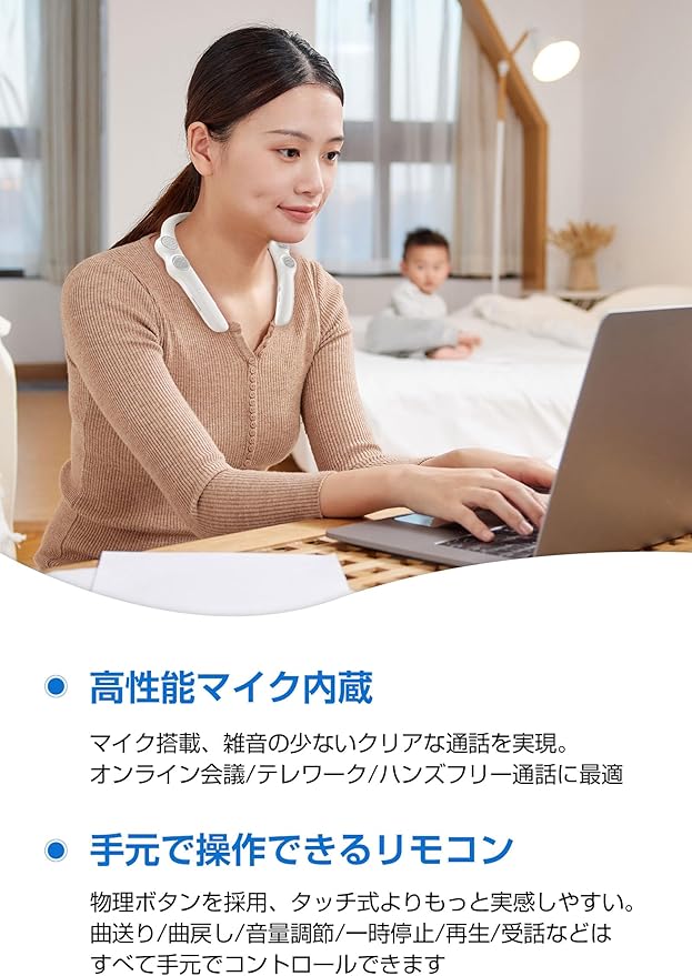 【高性能マイク内蔵 ハンズフリー通話】ノイズキャンセリングマイク搭載、雑音の少ないクリアな通話音質を実現。作業中に電話が入るとボタン一つで受話/拒否/リダイヤルができます。オンライン会議、オンライン授業、ビデオ通話に最適です。 【ソフトな素材で自然なつけ心地】ネック部分はしなやかに動けるから、着脱しやすく、首にピッタリフィットする快適な装着感を実現します。肩掛けスピーカーなので髪型が乱れることもなく、メガネやマスクの邪魔にもなりません。
