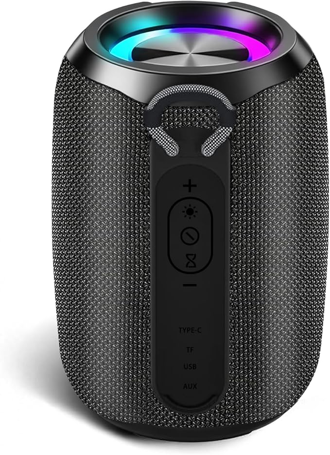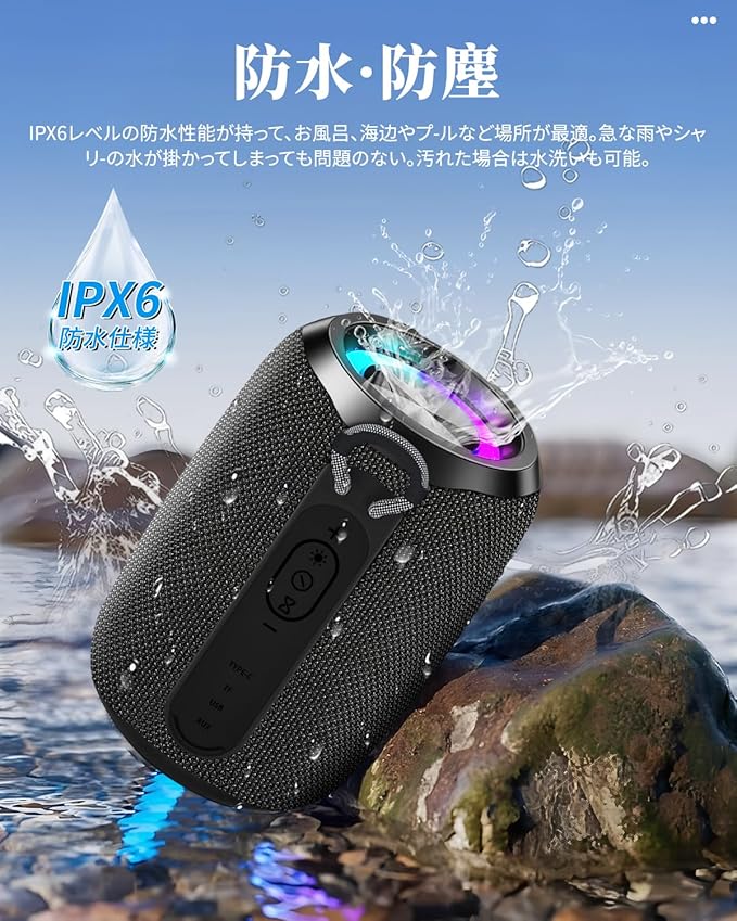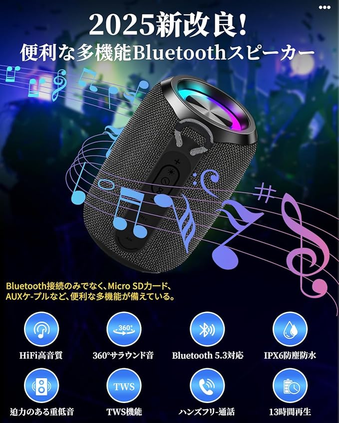 Bluetoothスピーカー【2025音質進化&360 サラウンド・サウンド】ワイヤレス スピーカー 強化された低音 ポータブルスピーカー Bluetooth5.3 IPX6防水 Type-C充電 長時間再生 LEDライト付き TWS機能/TFカード/AUX対応 マイク内蔵 ハンズフリー通話 アウトドアキャンプ/お風呂/車用 日本語取扱説明書 (ブラック)