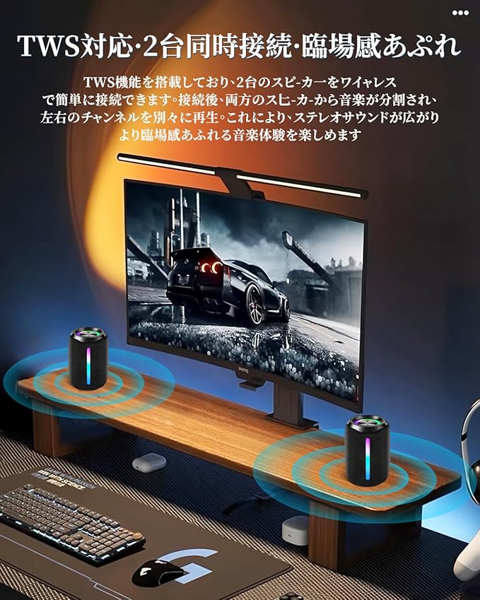 【Hi-Fiステレオサウンド&高音質重低音】 ワイヤレススピーカーには12W高性能オーディオ・ドライバーと進歩したデジタル信号プロセッサが搭載されており、どのボリュームでもクリアな高音、中音、特別に強化された低音が再生でき、最大の音量でも音は割れません。低音域の量感を増幅することにより、迫力のある低音で音楽を楽しめます。2つのワイヤレススピーカーがBluetooth接続で同期再生され、ワイヤレス左右チャンネルシステムを形成し、臨場感あふれるを実現します。家でもアウトドアでもコンサートのステレオサラウンドを楽しめます。